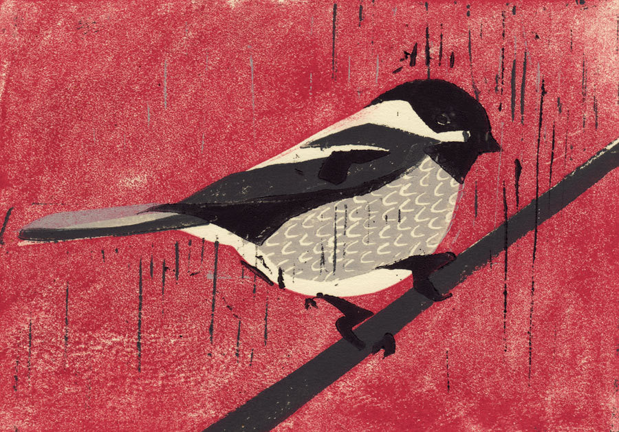 BLACK CAPPED CHICKADEE HAND-CARVED LINOCUT ILLUSTRATION ART PRINT BY ANNA SEE
